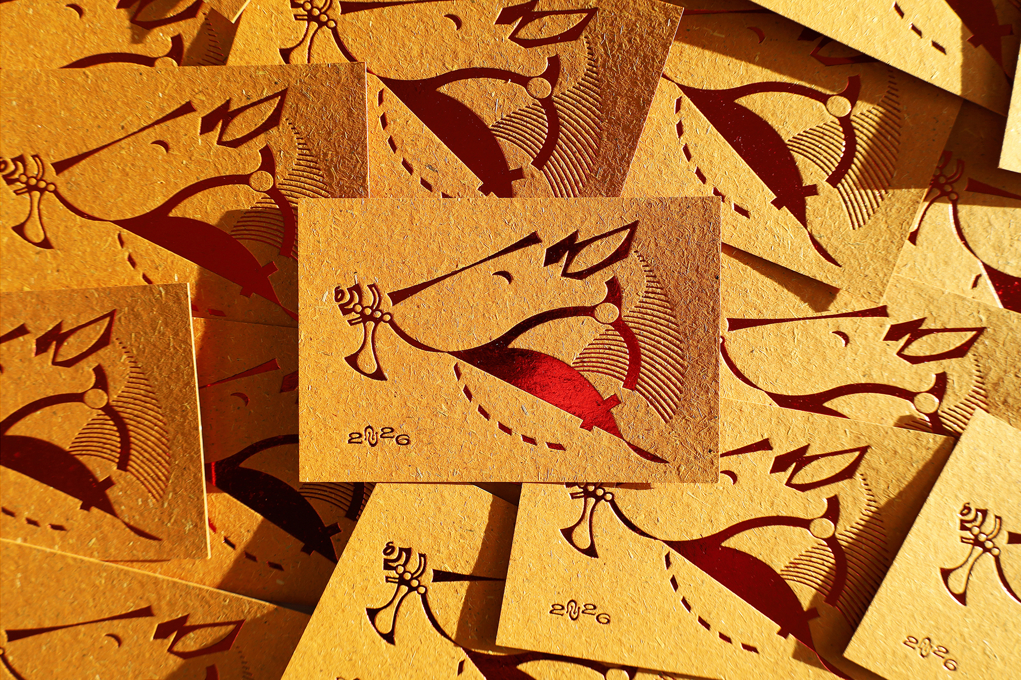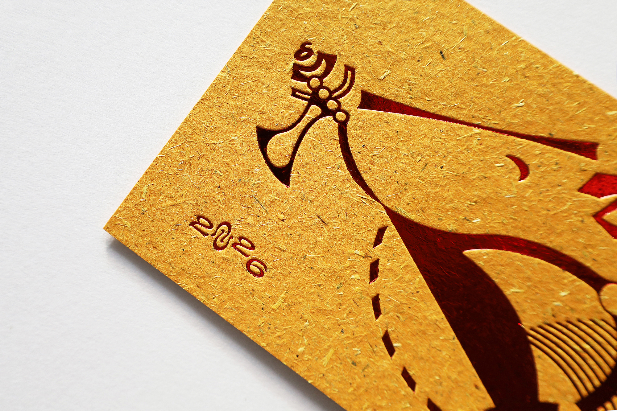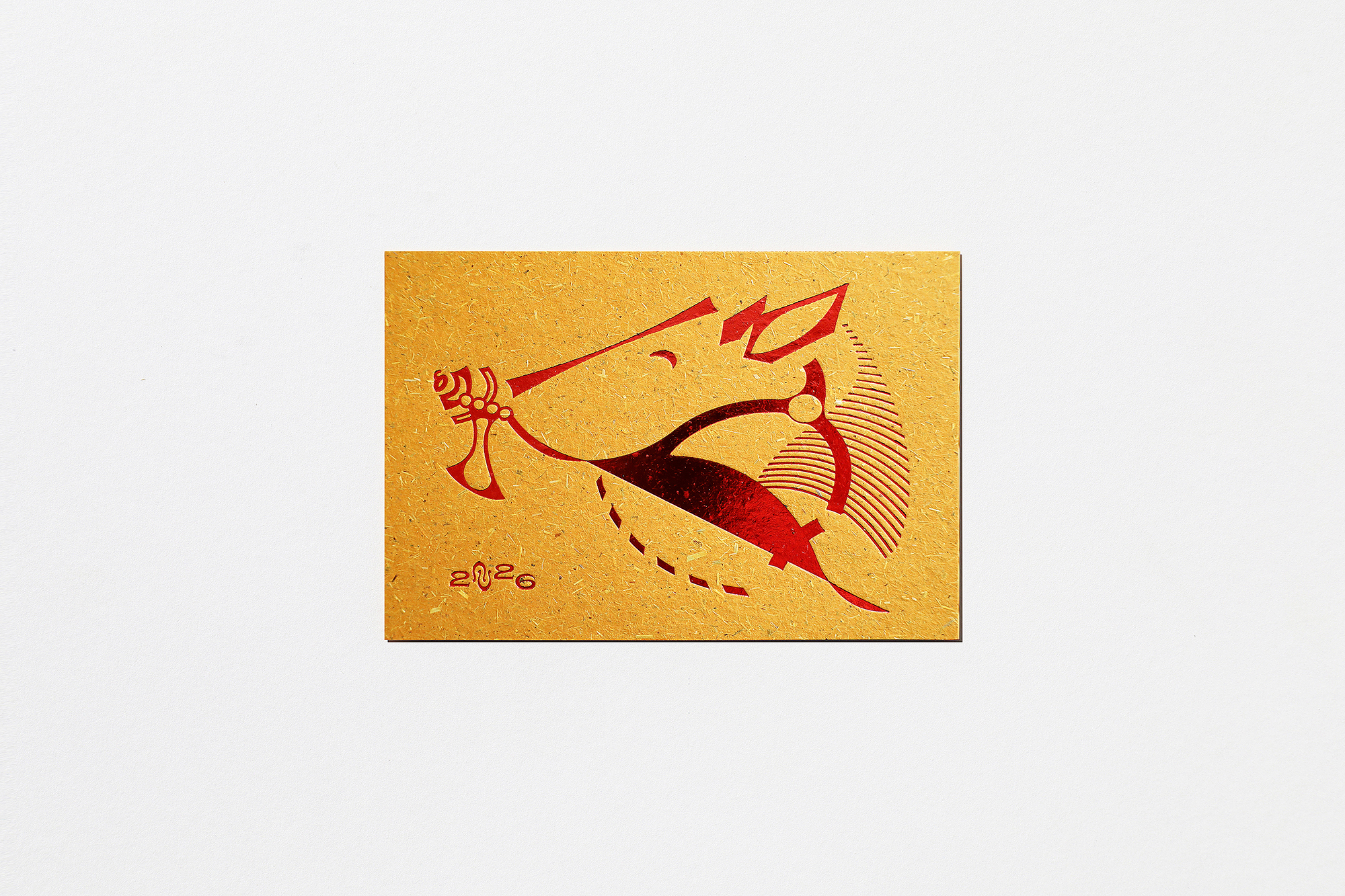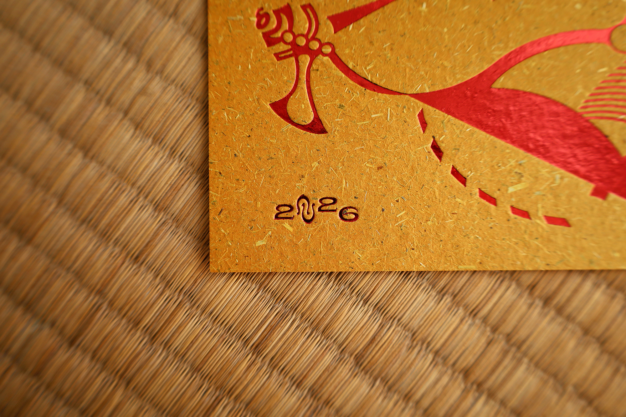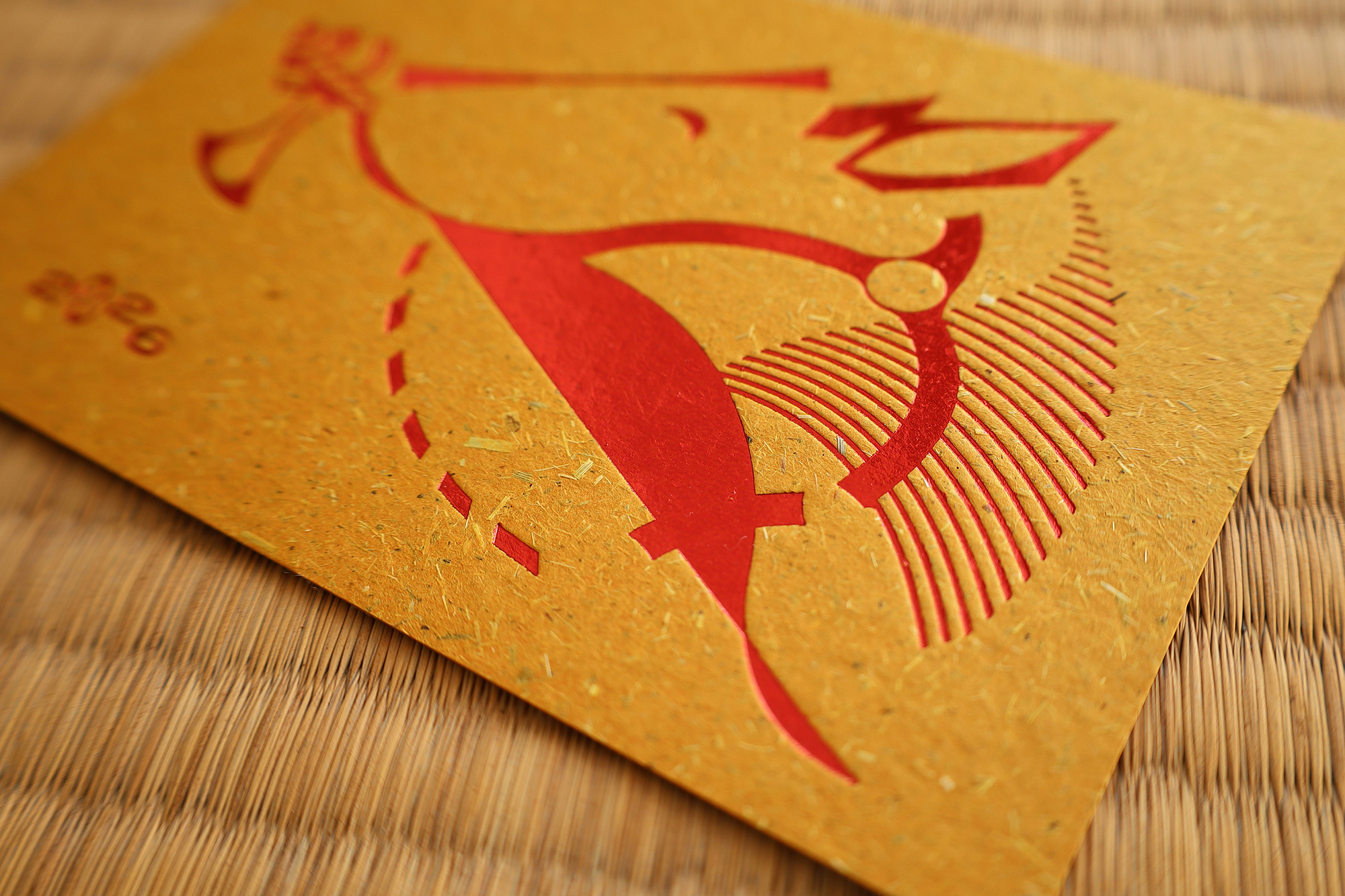 「クリエイター100人からの年賀状」展 vol.20 Greeting Card 2026 Paper : Gmund Mother Earth Curcuma 350g/m² Art Direction : 清水彬仁 Design : 清水彬仁 主催/株式会社 竹尾